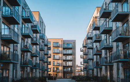 An exterior view showcases several modern apartment buildings with balconies. The composition emphasizes symmetry and linear perspective. The image features a clear, bright sky, suggesting a daytime setting with natural lighting. This image is suitable for various commercial purposes, including real estate and architectural design.