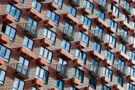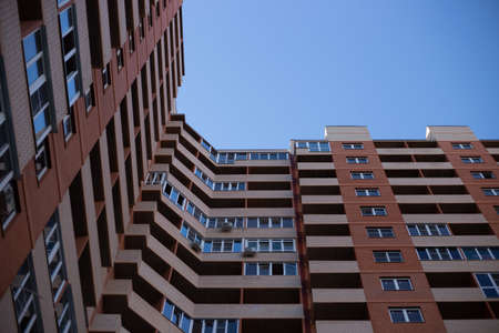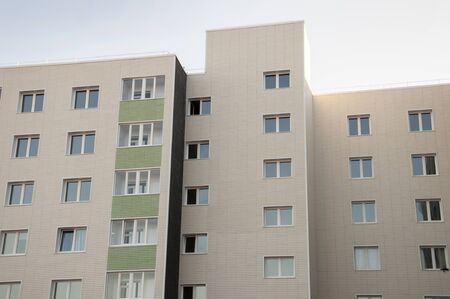 Multistorey new large apartment built of reinforced concrete. Under some Windows there is a platform for air conditioners.
