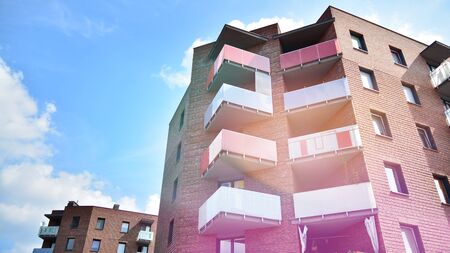 Colored residential building facade with balconies. Bright front view apartments with windows. Real estate in city