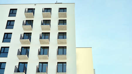 Detail of Modern residential flat apartment building exterior. Fragment of New luxury house and home complex. Part of City Real estate property and condo architecture. Copy space. Blue sky