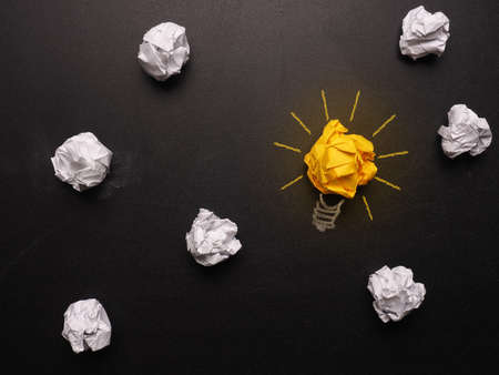 Inspiration concept crumpled paper light bulb on board