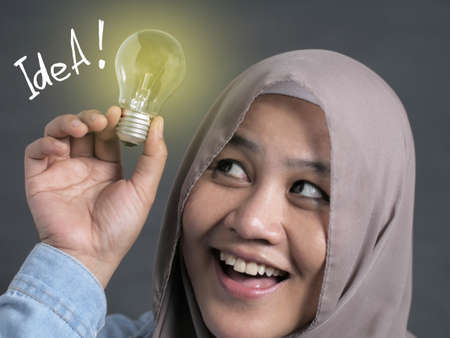 Asian muslim woman holds lamp bulb with smiling happy expression, idea concept with selective focus