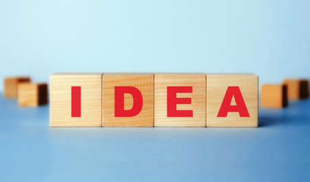 Wooden cubes with a red inscription IDEA, on a blue background.