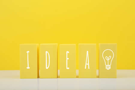 Concept of idea, creativity, start up or brainstorming. The word idea and bulb drawn on yellow toy blocks against bright yellow background with copy space.