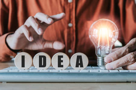 Businessman touching glowing light bulb on Idea wording print screen to wooden cube block for creative idea thinking and innovation concept.