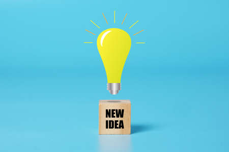 A picture of New Idea word at wooden block and lighten up bulb on blue background. New Idea and innovation concept