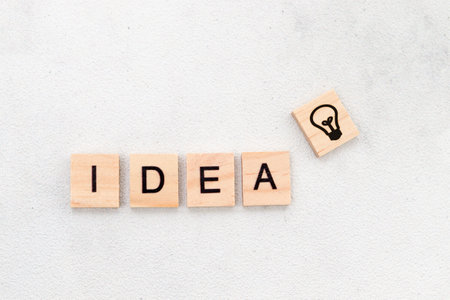 Top view of Idea word on wooden cube letter block on white background. Business concept