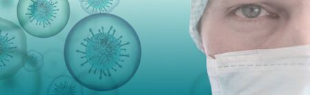 Corona Virus Covid-19 banner illustration - Doctor with protective medical mask andMicrobiology And Virology Concept