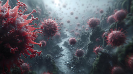 Digital rendering of a Covid-19 virus landscape. Depicts the spread of the virus.