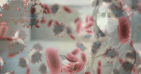 Digital illustration of macro Covid-19 and blood cells floating over a woman wearing a face mask. Coronavirus Covid-19 pandemic concept digitally generated