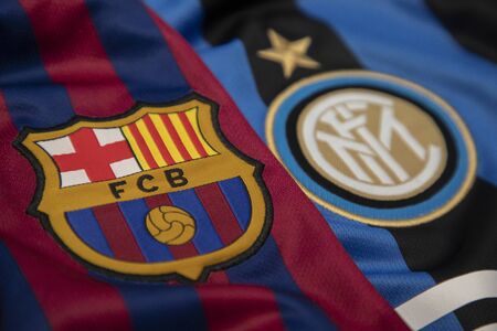 BANGKOK, THAILAND - October 24, 2018 : Logo of Barcelona and Inter Milan on the Jersey.Both of them will face each other in UCL tonight