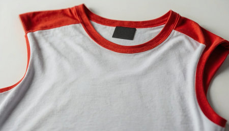 Close-up of a part of a stylish white and red T-shirt on a white background. Fashionable women's summer clothes for sports and leisure.