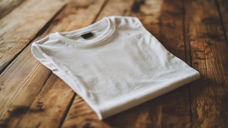 A neatly folded white t-shirt rests on a rustic wooden table, showcasing a logo centered on the chest. The warm wood enhances the casual yet stylish atmosphere of the room