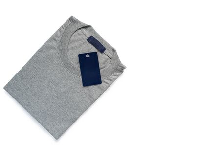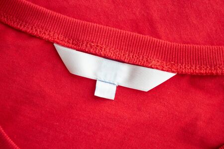 White blank clothing tag label on new red cotton shirt fabric texture background