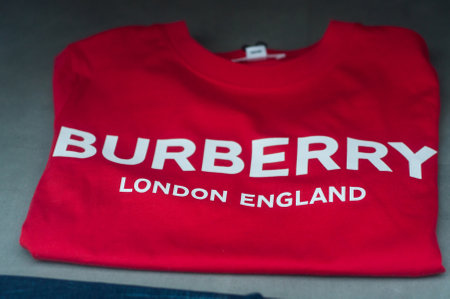 Mulhouse - France - 8 September 2019 - Closeup of Burberry sign on red tee shirt in fashion store showroom