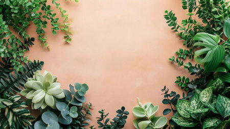 Various tropical plants create a vibrant green frame against a soft peach backdrop. Perfect for natural, summery designs.