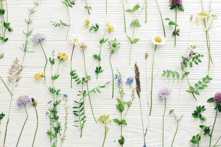 Spring flowers flat lay. Beautiful wildflowers stems and blooming petals composition on white wood, floral pattern. Hello Spring and green eco concept