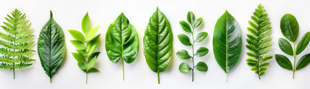 A beautiful arrangement of various green leaves on a light background, showcasing natural textures and colors. Ideal for eco-themed projects and designs.