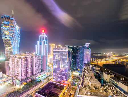 Beautiful night view of modern buildings in Cotai of Macau. Colorful city lights reflected in water. Wonderful cityscape. Cotai is a new gambling and tourism area with casinos and shopping malls.