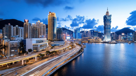 Generative AI : Aerial view of Hong Kong skyline along the waterfront at sunset Kowloon district Hong Kong China