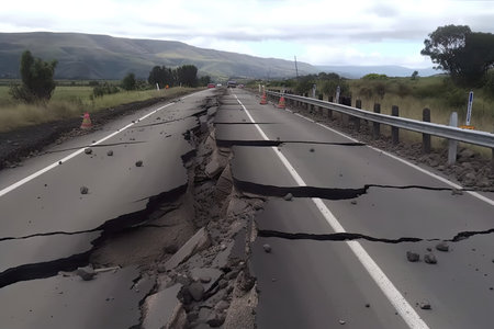 earthquake crack, earth fault from seismic plate movement on road. Generative AI.