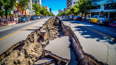 A stunning image of a cracked road surface resulting from earthquake damage, set against a backdrop of buildings and a vibrant blue sky.
