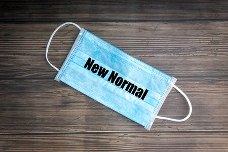 NEW NORMAL text with face mask on wooden background. Covid 19 and coronavirus concept