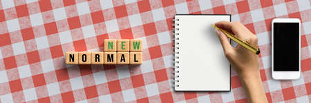 cubes with message NEW NORMAL and hand taking notes on kitchen table background