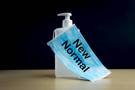 NEW NORMAL text with face mask and hand sanitizer on wooden background. Covid 19 and coronavirus concept