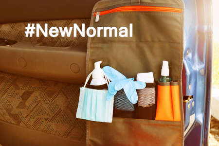 Word of New Normal in travel concept after Covid-19 / Coronavirus pandemic. Hanging bag in car consisting of liquid soap ,medical mask,hand towel,disposable gloves and hand sanitizer spray.
