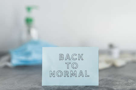 covid-19 vaccine race and life after the pandemic, Back to Normal message with Vaccine ampoule next to disposable gloves, hand sanitizer and face mask in the background