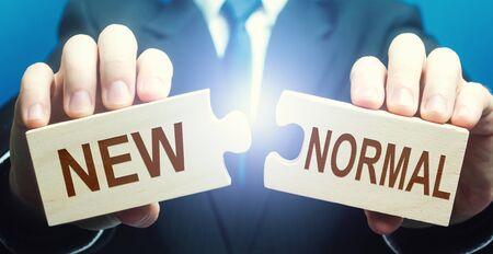 Man collects word New Normal from puzzles. Adaptation of business to post-crisis working conditions, implementation of new rules, search for online sales platforms for products. Opportunities