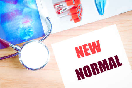 White notepad with the words NEW NORMAL and a stethoscope on a blue background.
