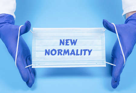 Gloved hands holding medical mask on blue background. Text design New normality, lettering on protective mask
