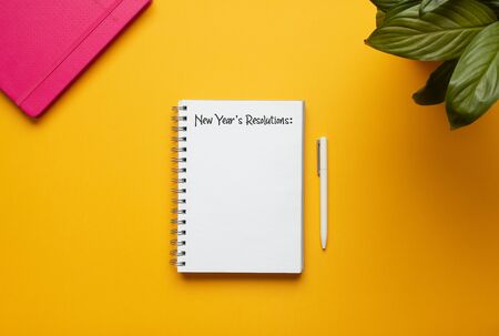 Stock photo of new year notebook with list of resolutions and objects on yellow background