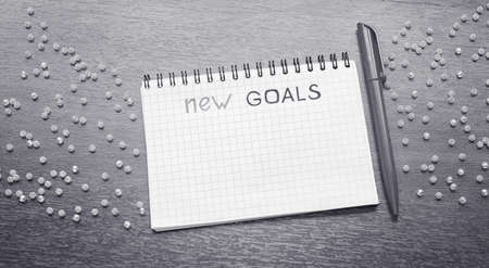 New Year resolutions concept - ‘NEW YEAR GOALS’ Written on a white notepad and placed on top of a 2020’s planner book.