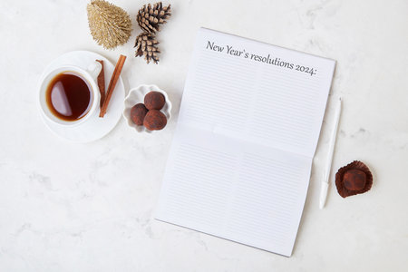 New Years resolutions 2024 text on white template notebook on the festive desk with coffee cup and truffles.