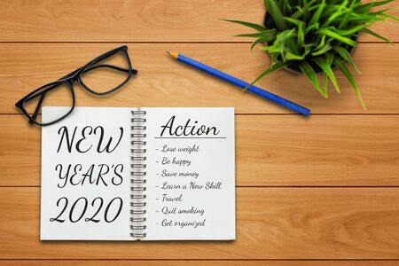 New Year Resolution Goal List 2020 - Business office desk with notebook written in handwriting about plan listing of new year goals and resolutions setting. Change and determination concept.