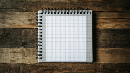 A blank spiral notebook rests on a rustic wooden table, perfect for creative projects or jotting down ideas. The natural textures add warmth to any workspace.