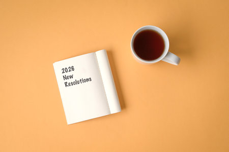 2026 New Resolutions on open notepad, next to cup of coffee. Top view.