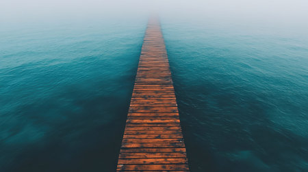 This image features a tranquil wooden dock extending into a foggy background, creating a serene atmosphere perfect for evoking feelings of calm and simplicity.