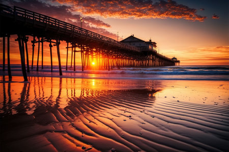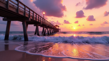 Enchanting sunset over ocean pier with dramatic cloudscape and soft waves.