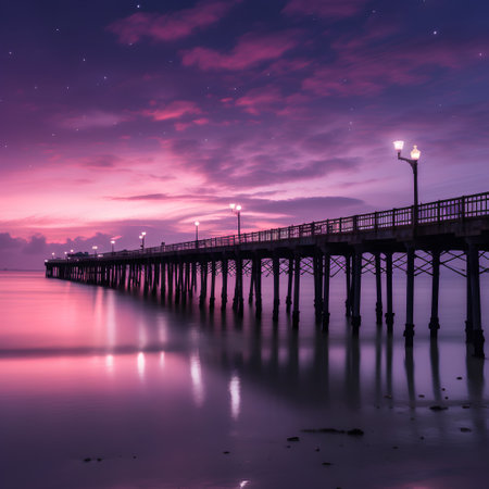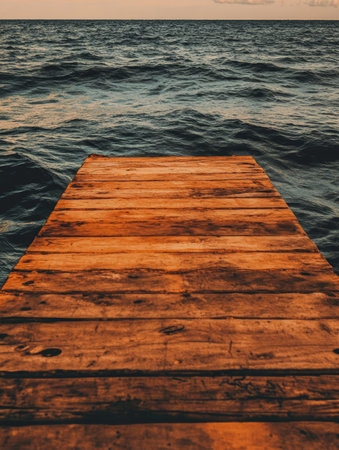 A wooden pier stretches into tranquil water under a dusky sky. Soft lighting illuminates the scene, casting reflections on the water's surface. The composition evokes a sense of peace and solitude. Suitable for illustrating travel, nature, or contemplative themes in various commercial and editorial projects.