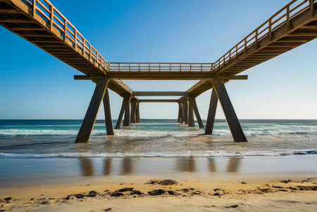 Bridge made of wooden planks on the sea beach. illustration of a vacation and travel