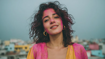 A woman with long, curly hair beams with happiness, showcasing her brightly colored traditional attire. The simple gray background highlights her joyful expression and vibrant clothing.