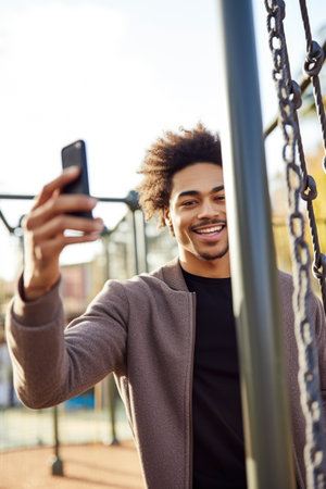 shot of a young man using his cellphone to take pictures at an outdoor playground, created with generative ai