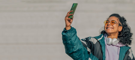 Trendy, cool and vlogging tourist taking a selfie on her phone with a beach background. Happy exchange student exploring the city by the ocean or sea coast and taking portrait photo for social media