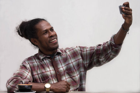 young black man talking selfie and smiling in camera, papua young man smile while selfie, papua man using smartphone and taking selfie