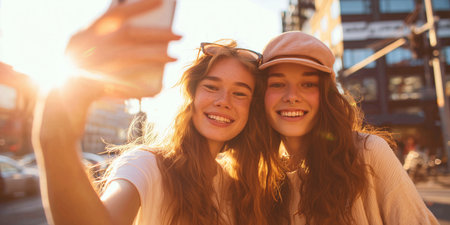 Two joyful young women capture a memorable moment outdoors, smiling brightly while taking selfies with a smartphone on a sunny day, highlighting friendship and happiness.