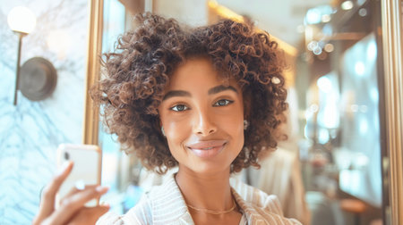 A young woman with curly hair smiles while taking a selfie in front of a mirror.